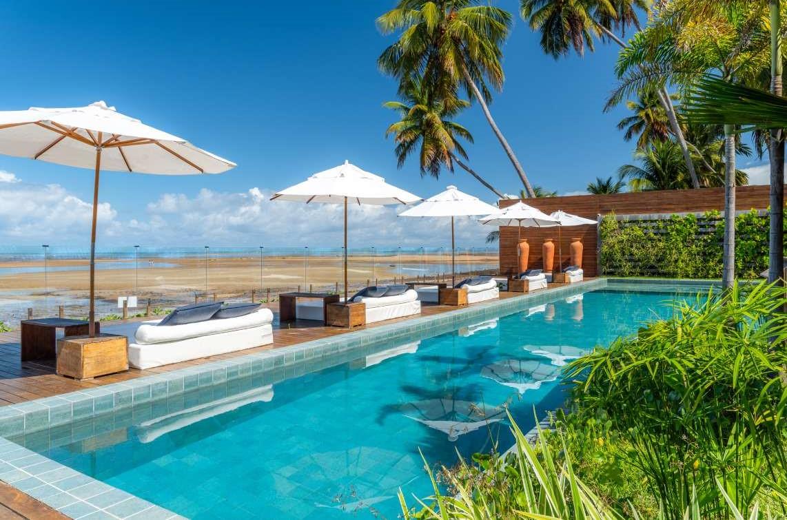 As acomodações são um convite ao bem-estar: suítes charmosas com banheiras relaxantes, varandas com vista para o mar e bangalôs inspirados em destinos exóticos, que trazem piscinas privativas, jardins e uma atmosfera única de intimidade e conforto.